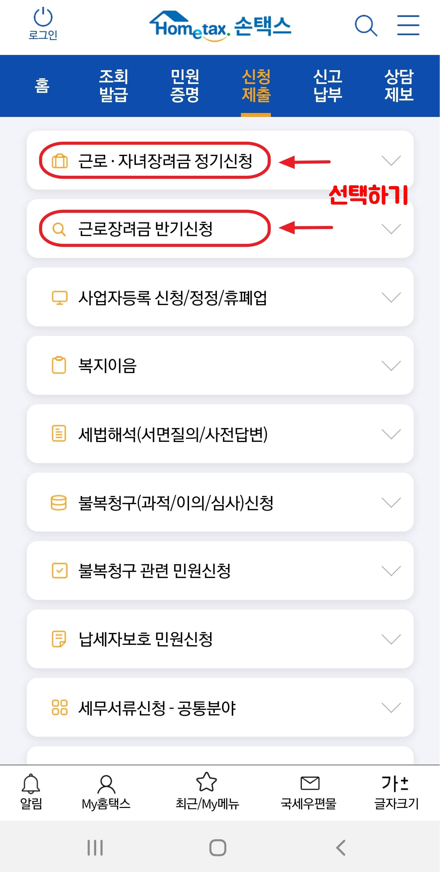 구글 Play 스토어 실행한 다음 → 검색창에 손택스를 검색 → 국세청 홈택스[손택스] 설치 후 실행 → 신청제출 항목 선택 → 근로장려금 반기신청 항목 선택 후 신청하기