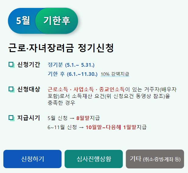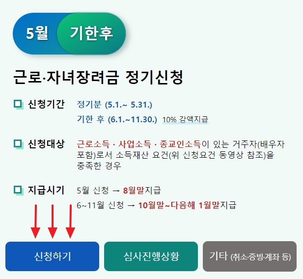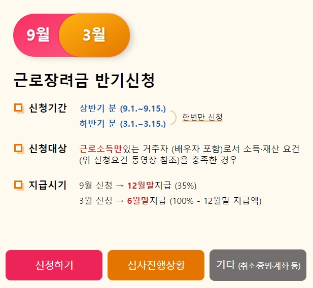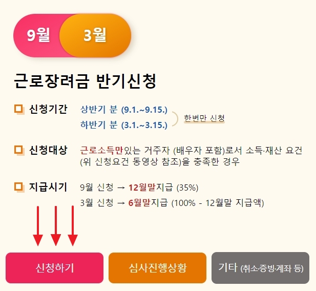 근로장려금 반기 신청 지급일 지급시기는 9월 신청 시 12월 말 지급(35%), 3월 신청 시 6월 말지급 (12월 말 지급액 100%)