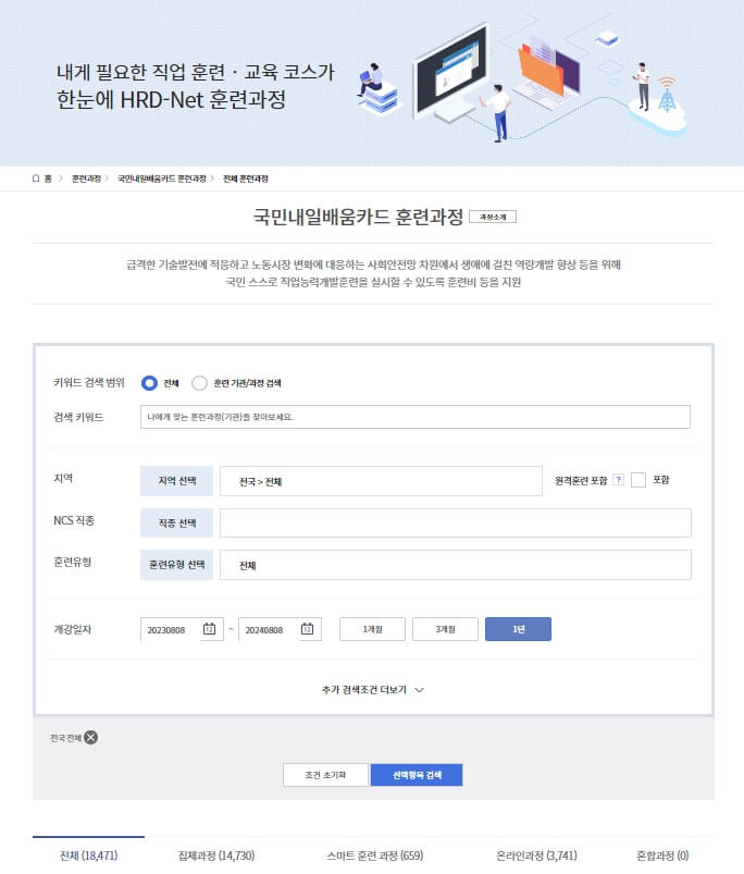 ② 국민내일배움카드 훈련과정에서 원하는 훈련과정을 검색한 후 수강 신청합니다.