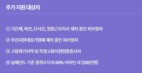 - 140시간 이상 훈련과정 수강하는 실업자, 주 15시간 미만 근로하는 피보험자, 근로장려금 수급자 등