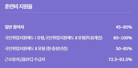 ① 지원 범위 내에서 훈련비의 45% ~ 85% 정도 국비로 지원됩니다.