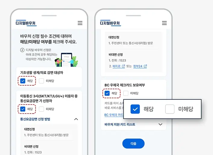 디지털 바우처 신청을 하게 되면 기존에 받고 있던 통신 요금 감면 지원이 자동으로 중단되며, 디지털 바우처와 통신 요금 감면 혜택이 중복 지원이 되지 않습니다.