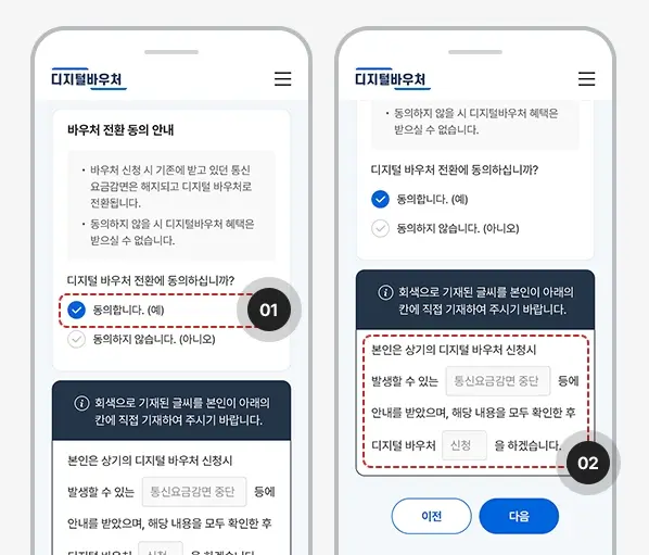 바우처 전환 내용 확인 후 동의하시고, 빨간 점선 안 회색으로 표기된 문구를 직접 기재해 주세요.