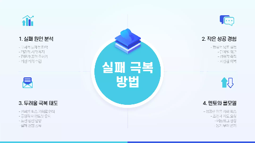 실패를 단순한 좌절로 여기지 말고, 배움의 기회로 삼아야 합니다. 실패를 경험할 때마다 무엇이 잘못되었는지 분석하고 개선할 수 있다면, 다음 도전에서는 더 나은 결과를 얻을 수 있습니다.