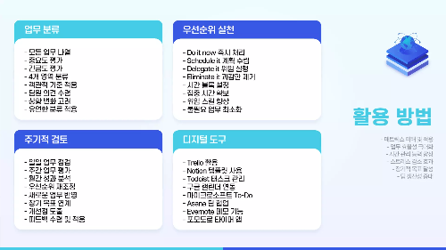 - 불필요한 회의 및 이메일 확인: 긴급하지도 중요하지도 않은 일로 최소화