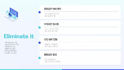 - 예: 불필요한 SNS 확인, 무의미한 웹서핑, 시간만 잡아먹는 잡담