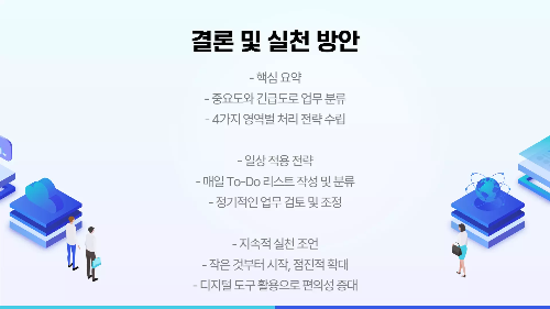 - 매일 또는 주간 단위로 업무 목록을 재정비하여 우선순위가 변하지 않았는지 점검합니다.