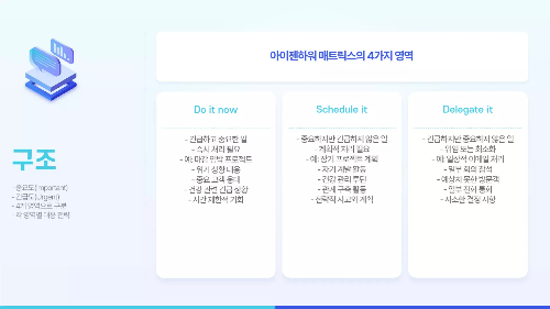 - 1 사분면(긴급하고 중요한 일): 즉시 실행