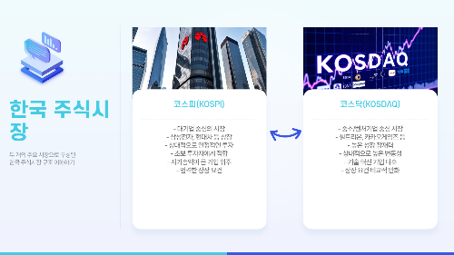 2. 주식시장의 기본 구조 우리나라 주식시장은 두 개의 큰 시장으로 나뉩니다.