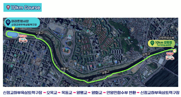 이번 러닝은 안양천과 한강을 따라 펼쳐지는 코스를 선택했습니다. 5km와 10km 두 가지 코스가 있으며, 각 코스의 시작점은 신정교하부육상트랙구장입니다. 코스는 잘 정비되어 있으며, 안전을 위해 의료팀과 자원봉사자들이 상시 대기하고 있습니다.