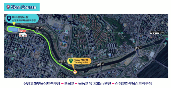 이번 러닝은 안양천과 한강을 따라 펼쳐지는 코스를 선택했습니다. 5km와 10km 두 가지 코스가 있으며, 각 코스의 시작점은 신정교하부육상트랙구장입니다. 코스는 잘 정비되어 있으며, 안전을 위해 의료팀과 자원봉사자들이 상시 대기하고 있습니다.